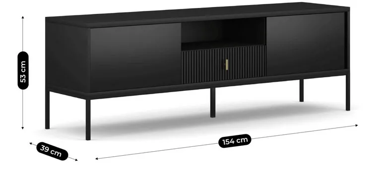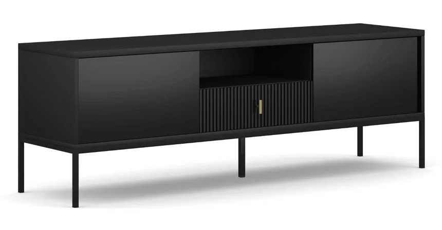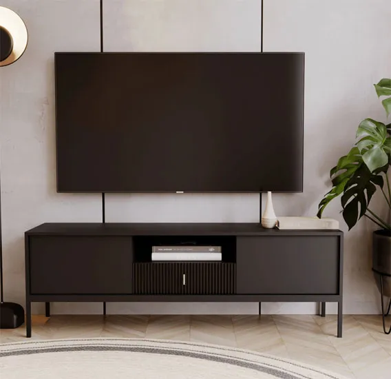 • Praktyczne wnętrze – otwarta półka z przelotką na kable oraz zamknięte szafki po bokach umożliwiają estetyczne i wygodne przechowywanie urządzeń,