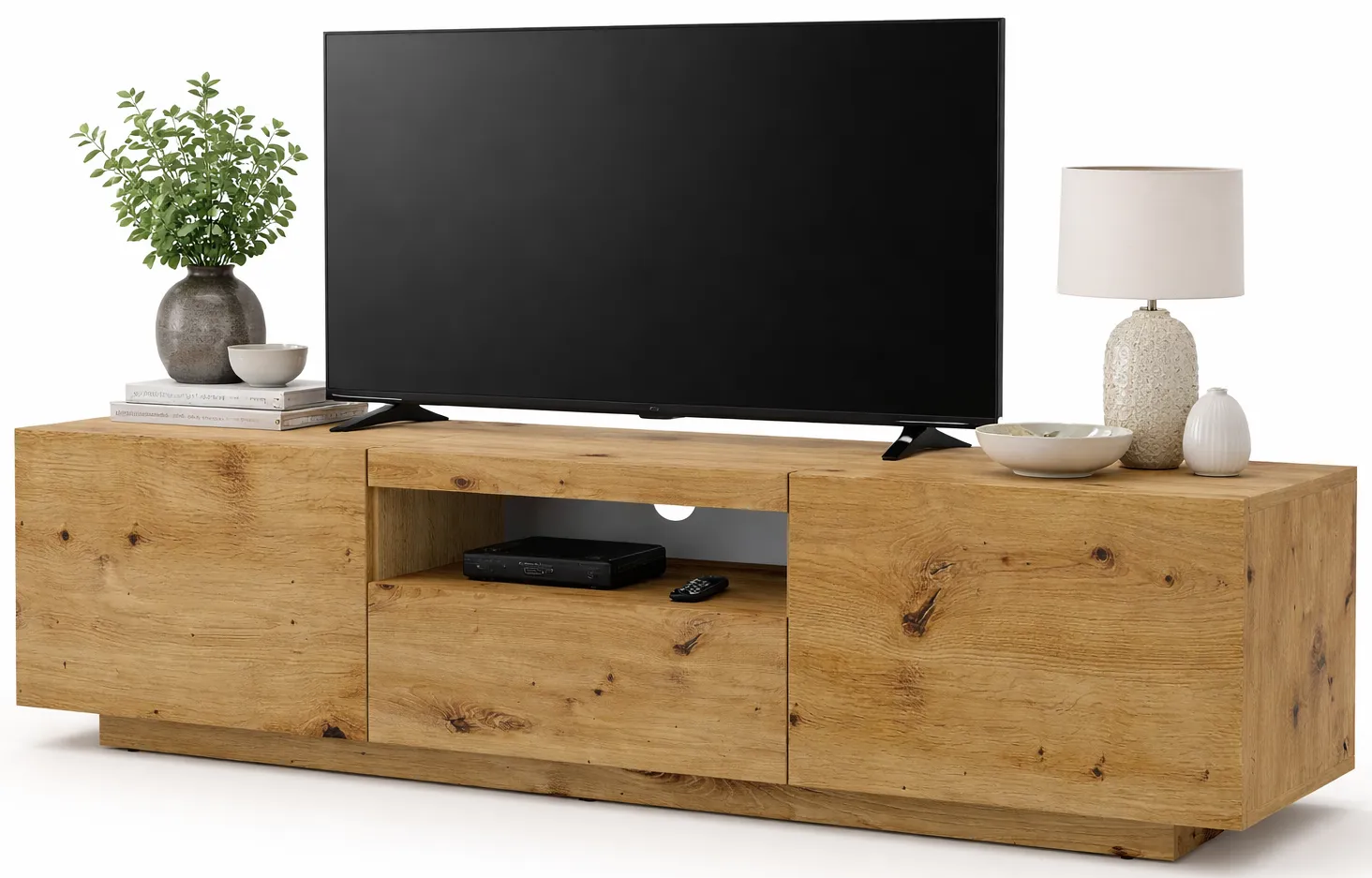 Szafka pod rtv to był dobry wybór.! Jest solidna, a jej dębowe wykończenie w kolorze artisan dodaje elegancji mojemu salonowi. Ogromnym plusem jest możliwość montażu wiszącego lub stojącego, co daje sporo opcji aranżacyjnych. Montaż był prosty, a dostawa szybka