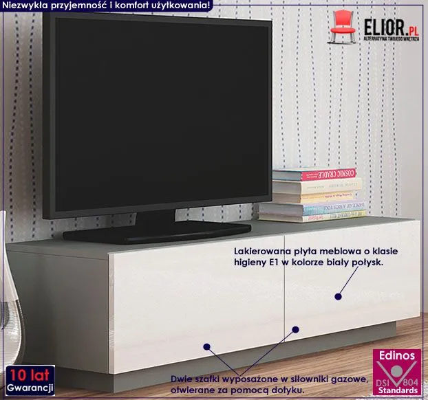 Designerska stojąca szafka RTV Vitoria 6X wyróżnia się nie tylko swoją praktyczną formą i eleganckim kształtem, ale także zastosowaniem materiałów najlepszej jakości. To dlatego cieszy się powodzeniem wśród osób lubiących nowatorskie rozwiązania. Użyta do produkcji frontów szafki lakierowana płyta meblowa w kolorze biały połysk została uszlachetniona cienkimi filmami melaminowymi. Posiada także specjalne włókna ułożone różnokierunkowo o strukturze sinusoidalnej, co zapewnia nadanie jej cech jakościowych oraz wytrzymałościowych. Zastosowana technologia sprzyja utrzymywaniu mebla w czystości. Korpus mebla w kolorze popiel mat wyprodukowano z płyty laminowanej o podwyższonej trwałości i gęstości. Drzwiczki z systemem push-click (szafka nie posiada uchwytów - otwierana jest za pomocą dotyku) wyposażone w profesjonalne siłowniki gazowe gwarantują Ci niezwykle funkcjonalne korzystanie z mebla. Dwie zamykane szafki są niezwykle praktyczne i bez problemu pozwalają Ci zmieścić nie tylko kolekcję filmów. Stonowana kolorystyka i prosta forma sprawiają, że szafka pod telewizor Vitoria 6X doskonale sprawdza się we wnętrzach urządzonych w stylu minimalistycznym czy nowoczesnym. Nadaj Twojemu wnętrzu wyrazistego designu, harmonizując go z czystością prawdziwej bieli i szlachetnością modnej szarości!