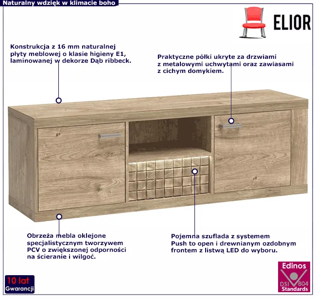 Szafkę RTV Leticia 14X zrobiliśmy z najwyższej jakości 16 mm laminowanej płyty meblowej o klasie higieny E1. Płyta charakteryzuje się ciekawą strukturą, która idealnie odwzorowuje naturalną fakturę i usłojenie drewna. Brzegi mebla zostały precyzyjnie oklejone specjalistycznym tworzywem PCV o zwiększonej odporności na ścieranie i wilgoć. Dekoracyjny akcent w postaci naturalnej sosnowej listwy rzeźbionej w przestrzenny wzór kratki fenomenalnie podnosi walory dekoracyjne mebla. A dodatkowa opcja oświetlenia LED subtelnie wyeksponuje oryginalny dekor. Przestronny blat szafki stanowi doskonałe miejsce na odbiornik telewizyjny, sprzęt audio lub stylowe dekoracje. Pod blatem umieściliśmy otwartą półkę na dekodery oraz szufladę do przechowywania akcesoriów. Szuflada wyposażona w mechanizm "push to open" otwiera się po lekkim naciśnięciu frontu w odpowiednim miejscu, gwarantując natychmiastowy dostęp do zawartości. W bocznych części mebla znajdują się 2 praktyczne szafki, każda z półką dzielącą przestrzeń na pół. Drzwi szafek wyposażone w system cichego domyku Blumer 4X Plus, otwierają i zamykają się lekko i bezszelestnie. Tak wykonana szafka RTV Leticia 14X marki Edinos Premium świetnie sprawdzi się w salonie, sypialni, pokoju młodzieżowym lub gabinecie zapewniając nie tylko sporo miejsca do przechowywania, ale także fenomenalnie dekorując wnętrze.