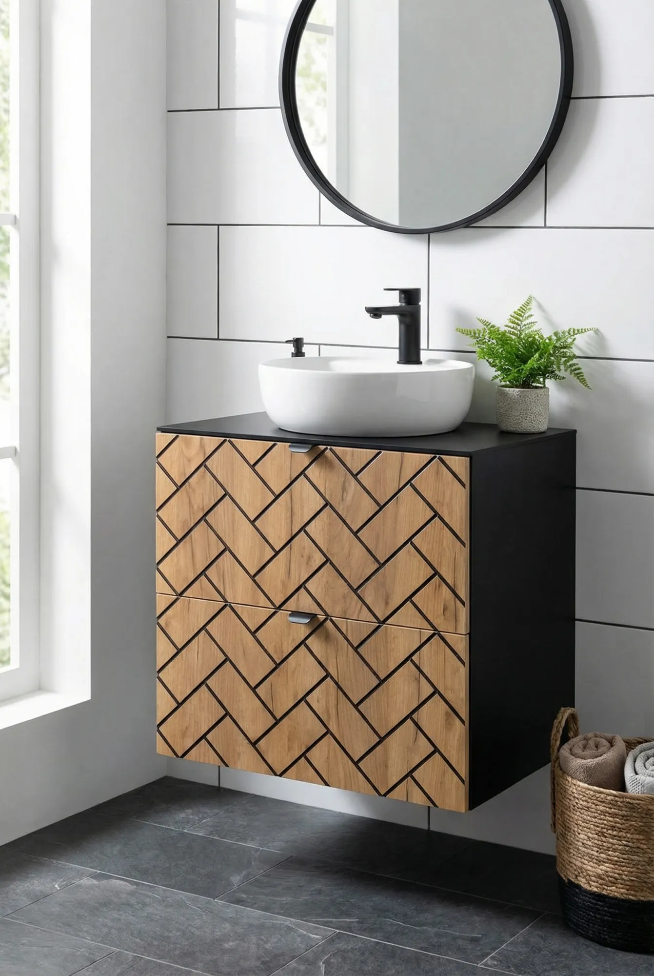 Aranżacja łazienki z szafką umywalkową w jodełkę Aploni 4X