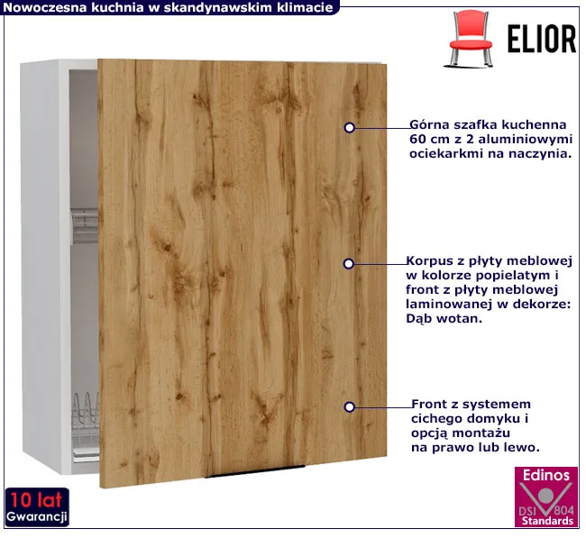 Kolekcja mebli kuchennych Madlen marki Elior to więcej niż meble – to zaproszenie do świata gdzie prostota i funkcjonalność tworzą przestrzeń do kreatywnej przygody w świecie smaków i aromatów. Zjawiskowy design frontów w 2 unikalnych wydaniach: ciepłej barwie dębu wotan lub skandynwskiej szarości nadaje wnętrzu ponadczasowej elegancji. Atutem kolekcji jest wysoka jakość w atrakcyjnej cenie, profesjonalne wykonanie oraz możliwość stworzenia własnego zestawu kuchennego dostosowanego do potrzeb. Kolekcja Madlen składa się z 32 elementów: szafek dolnych i górnych, słupków, mebli do zabudowy sprzętu AGD: piekarnika, mikrofalówki, płyt grzewczych, okapów, zmywarek, szafek na zlew oraz szafek z suszarką na naczynia i koszami cargo. Bogaty wybór modeli to doskonały przepis na aranżację każdej kuchni, od tych przestronnych, przez niewielkie, aż po mini aneksy kuchenne. Oto kolejna propozycja z kolekcji Madlen – szafka z suszarką na naczynia 60 cm Livin 30X!