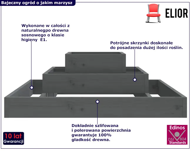 • Solidność i trwałość: kiedy dotkniesz ramy z litego drewna sosnowego, poczujesz stabilność i solidność donicy - nie tylko teraz, ale także przez wiele sezonów.