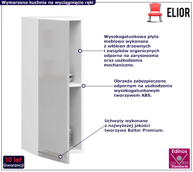 Oto jedna z szafek górnych z kolekcji Cortez marki Edinos Premium - Poli 11X. Szafka ta zaprojektowana została z myślą o maksymalnym wykorzystaniu miejsca. Oferuje dwie praktyczne półki, które idealnie nadają się do przechowywania różnorodnych kuchennych akcesoriów i przypraw. Dzięki niej uzyskasz ład i harmonię oraz zapewnisz sobie wygodny dostęp do najczęściej używanych przedmiotów. Szafka Poli 11X, wykonana z trwałych materiałów, łączy w sobie funkcjonalność z nowoczesnym designem, będąc doskonałym uzupełnieniem Twojej kuchni.