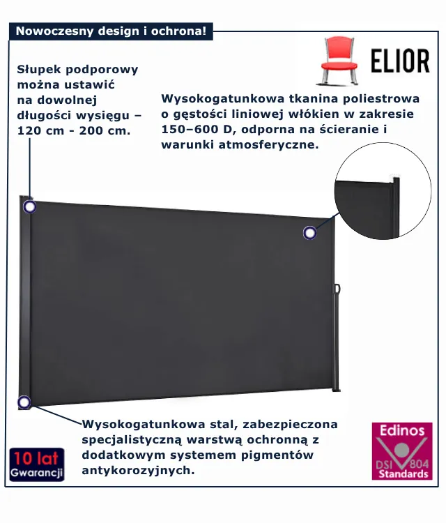 Markiza Kosy marki Edinos Premium to inwestycja w komfort i niezależność od kaprysów pogody za jedyne 498 zł. Sprawdź już dziś i stwórz swoją idealną strefę relaksu. Markiza Kosy marki Edinos Premium to połączenie inteligentnych rozwiązań i ergonomicznego designu.