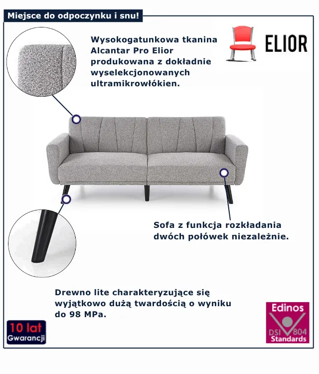Nowoczesny wygląd i funkcjonalność. Szara tkanina wygląda elegancko i jest odporna na codzienne użytkowanie. Rozkładanie nie sprawia problemów, a mebel jest stabilny zarówno w wersji siedzącej, jak i spania. Dodatkowo, cena jest atrakcyjna w porównaniu do jakości. Mam ją od kilku tygodni i jestem bardzo zadowolony z zakupu!