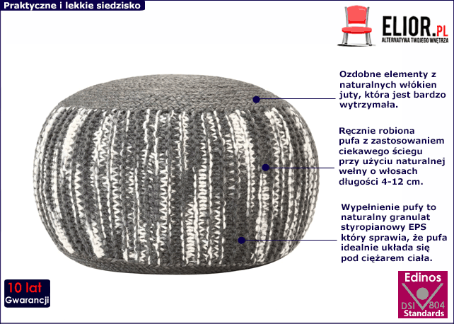 Naturalne włókno białkowe uzyskiwane jest z okrywy włosowej owiec i jagniąt. Wysokiej jakości wełnę, bardzo miękką, puszystą, o cienkich włóknach, długości od 4 do 12 cm, otrzymuje się z owiec rasy merynos. Hipoalergiczne i antybakteryjne właściwości tego materiału zapewniają całkowite bezpieczeństwo podczas użytkowania mebla. Naturalna wełna nie powoduje alergii, wręcz przeciwnie – obniża reakcje alergiczne i eliminuje warunki rozwoju roztocza. Nie wchłania zapachów, kurzu i skutecznie neutralizuje szkodliwe substancje w powietrzu w zamkniętych pomieszczeniach. Granulat EPS używany do wypełnienia pufy przez producentów marki Edinos Premium, jest surowcem pierwszej jakości. Granulki styropianowe sprawiają, że pufa idealnie układa się pod ciężarem ciała, zachowuje twardość przy jednoczesnym zachowaniu wysokiego komfortu. Granulat EPS posiada atest PZH, dzięki czemu odpowiada restrykcyjnym wymaganiom higienicznym. Wielkość kulek jest losowa, waha się między 1-10 mm, kulki są sprężyste i idealnie okrągłe w przeciwieństwie do poszarpanego, zmielonego styropianu - granulatu styropianowego. W asortymencie marki Edinos Premium znajdują się również pufy z ozdobnym element z naturalnych włókien juty. Juta jest trwała i mocna. Jest materiałem w pełni biodegradowalnym. Dzięki temu ma duże możliwości recyklingowe. Podczas gdy niektóre włókna naturalne są szorstkie w dotyku, juta jest najdelikatniejszym włóknem pochodzenia roślinnego. Warto dodać, że przy coraz dłuższym czasem użytkowania szlachetnieje, zachowując się podobnie do lnu. Juta stanowi idealny, naturalny akcent do wystrojów wnętrz w skandynawskim czy też rustykalnym stylu.