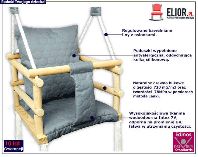 Stelaż huśtawki Dalo został stworzony z naturalnego drewna bukowego. Jest to jeden z najtrwalszych gatunków drewna, idealny do wyrobu mebli. Charakteryzuje się wysoką gęstością na poziomie do 720 mg/m3 oraz wyjątkowo dużą twardością 78 MPa w pomiarach metodą Janki. Drewno zestawiliśmy z poduszkami wykonanymi z wodoodpornej tkaniny Intex 7V. Wyróżnia się wysoką odpornością na warunki atmosferyczne, a zwłaszcza promienie UV. Jest także niezwykle wytrzymała na nacisk i rozciąganie. Warstwa vinylu ogranicza przyleganie kurzu, brudu czy pleśni, nawet w najbardziej skrajnych warunkach pogodowych. Tkanina ta nie wchłania wilgoci i szybko schnie. Dzięki niej huśtawka może spokojnie zawisnąć na tarasie lub w ogrodzie, a Twoje dziecko może spędzić na niej wiele radosnych chwil!