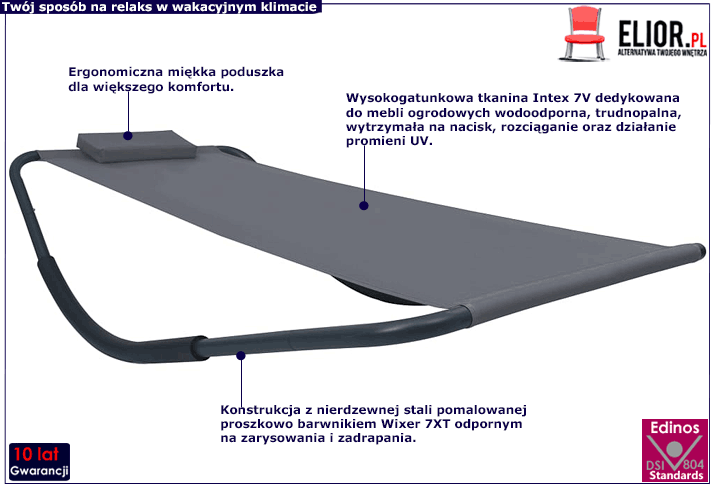 Komfortowy leżak ogrodowy Wintex 5X marki Edinos Premium wyróżnia się nie tylko nowoczesną formą, ale także zastosowaniem materiałów najlepszej jakości. Ten wyjątkowy model został wykonany zgodnie z najwyższymi standardami jakości i bezpieczeństwa. Konstrukcja leżaka powstała ze specjalistycznej stali nierdzewnej o ponadprzeciętnej odporności na warunki klimatyczne. Stelaż pomalowaliśmy proszkowo profesjonalnym środkiem odpornym na zarysowania i zadrapania. Najwyższa jakość techniki metody natrysku proszkowego pozwoliła zaoferować marce Edinos Premium aż 10 lat gwar. na swoje produkty. Technika malowania proszkowego charakteryzuje się dużą trwałością, odpornością na korozję, chemikalia, wysoką temperaturę oraz uszkodzenia mechaniczne, dzięki czemu znacznie podnosi walory użytkowe i estetyczne mebla. Siedzisko stworzyliśmy z nowoczesnej tkaniny Intex 7V typu textilene stosowanej w meblach tarasowych i ogrodowych. To tkanina z mocnych włókien polimerowych o dekoracyjnym siatkowym splocie. Jest powlekana warstwą winylu o właściwościach termoplastycznych. Siedzisko z tkaniny Intex 7V dopasowuje się do kształtu ciała osoby na nim siedzącej, a jednocześnie nie odkształca się trwale. Tkanina jest łatwa w czyszczeniu, wystraszy przetrzeć ja wilgotną ściereczką z delikatnym detergentem. Warstwa winylu dodatkowo ogranicza przyleganie kurzu, brudu, czy pleśni, nawet w skrajnych warunkach pogodowych. Ponadto nie wchłania wilgoci, szybko schnie, a dzięki odporności na promieniowanie UV kolor nie blaknie przy eksploatacji na pełnym słońcu. Dzięki zastosowaniu wysokiej klasy materiałów leżak ogrodowy Wintex 5X pozwoli Ci wypoczywać luksusowo i cieszyć się wakacyjnym klimatem przez wiele sezonów.