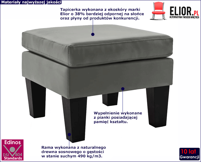 Projektując puf Cameron wybraliśmy tylko najlepsze materiały, aby mebel ten cechował się najwyższą jakością oraz wieloletnią trwałością. Solidną ramę wykonano w całości z naturalnego i prawdziwego drewna sosnowego. Dokładnie szlifowana powierzchnia materiału zabezpieczona została naturalnym impregnatem ochronnym, który chroni przed zarysowaniem oraz przetarciem drewna. Emulsje ochronne marki Elior produkowane na bazie wody są całkowicie wolne od formaldehydu, dzięki czemu charakteryzują się neutralnym zapachem. Nie zawierają substancji, które w trakcie użytkowania mebli mogą się ulatniać, ani innych szkodliwych związków chemicznych. Dzięki temu są dobrze tolerowane przez alergików oraz osoby wrażliwe i co najważniejsze - mają neutralny wpływ na Twoje zdrowie. Designerska tapicerka pokryta została najwyższej jakości ekoskórą, łatwą do utrzymania w czystości. Ekoskóra używana przy produkcji mebli marki Elior jest o wiele bardziej odporna na słońce oraz substancje płynne , co pozwala Ci na długie i bezpieczne użytkowanie. Do wypełnienia pufy użyto pianki z pamięcią kształtu - nowoczesnego, technologicznie zaawansowanego materiału wykonanego z miękkiej pianki poliuretanowej.