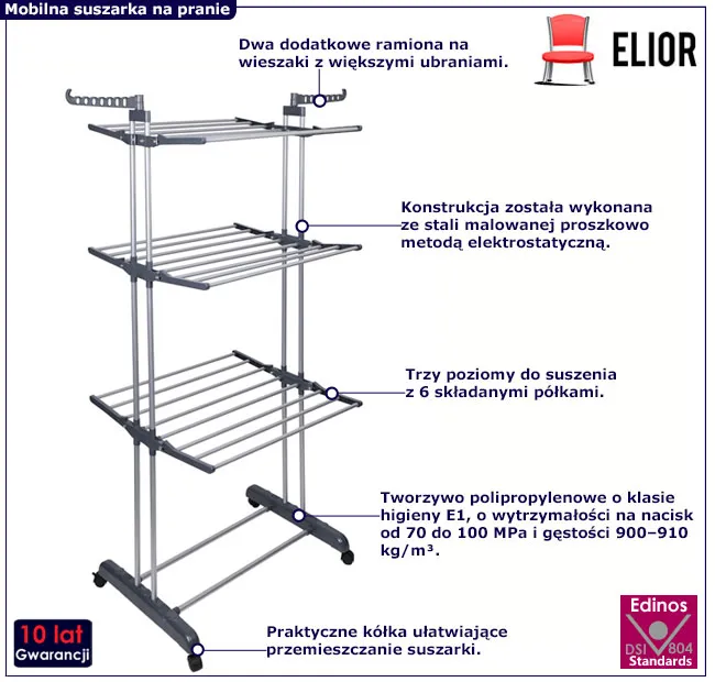 Zacznij suszyć pranie z przyjemnością! To możliwe dzięki suszarce Garela marki Edinos Premium. Pamiętaj, że w razie potrzeby możesz złożyć wszystkie półki i z pomocą kółek przestawić ją w inne miejsce! Nie czekaj więc i zamów ją w promocyjnej cenie 118 zł już dziś!