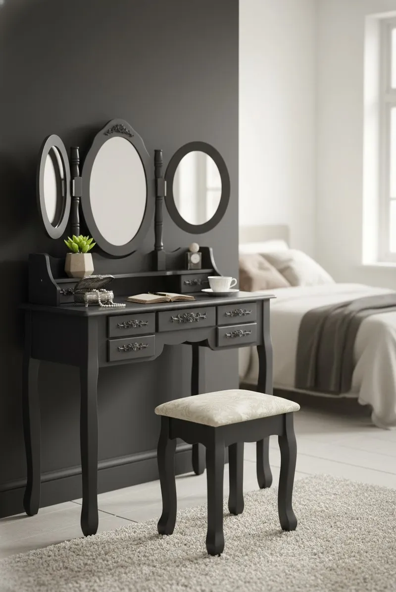 Szara toaletka z potrójnym lustrem i tapicerowanym stołkiem - Savita