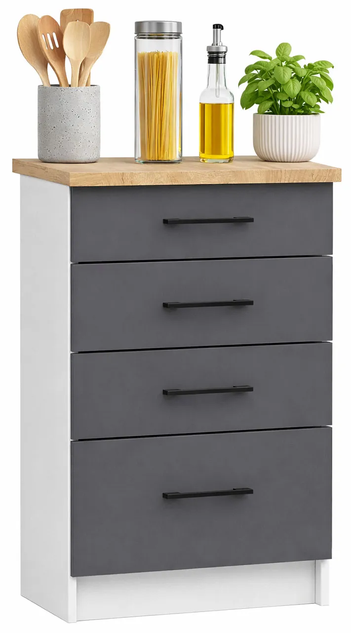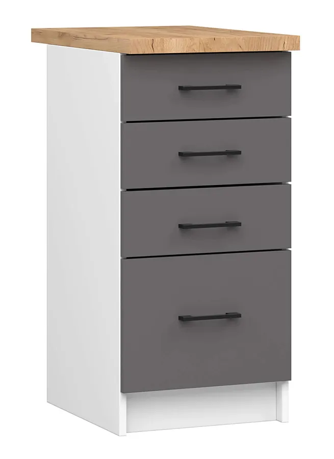 Kolekcja mebli kuchennych Tereza to cała gama różnego rodzaju szafek pozwalających w szybki i łatwy sposób stworzyć kompletną kolekcję przystosowaną do Twoich potrzeb. Jedną z nich jest dolna szafka z blatem Vivienne 11X. Elegancki, minimalistyczny design jest nie tylko doskonałą bazą do tworzenia indywidualnego projektu, ale także idealnym wyborem do wnętrz w stylu minimalistycznym lub skandynawskim. Szafka ta ukrywa we wnętrzu cztery pojemne szuflady, które pozwolą Ci doskonale zorganizować kuchenną przestrzeń!