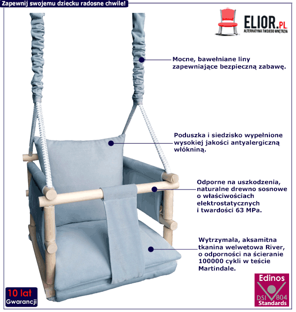 Funkcjonalna huśtawka Eleonor nie tylko zadba o rozrywkę Twojej pociechy, ale również zapewni pełne bezpieczeństwo i komfort. Wszystko dzięki najwyższej jakości materiałom, użytych do jej produkcji. Bazę huśtawki stanowi trwałe drewno sosnowe, które wykazuje się wysoką odpornością na uszkodzenia, dzięki twardości na poziomie 63 PMa w pomiarach metodą Janki. Ponad to, drewno to wykazuje właściwości elektrostatyczne oraz reguluje poziom wilgotności powietrza. Solidne, nieśmiertelne drewno połączyliśmy z przepiękną tkaniną welwetową River. Nie tylko spektakularnie się prezentuje i jest miła w dotyku, ale także cechuje się ponadprzeciętną wytrzymałością i odpornością na ścieranie - do 100000 cykli w teście Martindale. Wypełnienie poduszki i siedziska stanowi najwyższej jakości, antyalergiczna włóknina. Aby zwieńczyć tak doskonałe dzieło, wykorzystaliśmy mocne, bawełniane liny utrzymujące siedzisko. Masz więc pewność, że Twoja latorośl będzie w pełni bezpieczna korzystając z huśtawki Eleonor!
