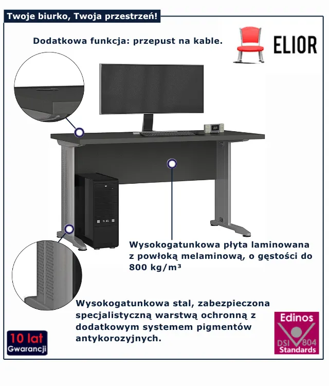 Twój domowy kącik do pracy zasługuje na mebel, który łączy praktyczność z elegancją. Biurko Rook marki Edinos Premium to propozycja dla tych, którzy cenią sobie minimalistyczny styl, ale nie chcą rezygnować z trwałości i wygody. Dzięki uniwersalnej formie pasuje zarówno do nowoczesnych, jak i bardziej klasycznych wnętrz. Masz dość bałaganu na blacie i plątaniny kabli? Przepust na przewody oraz wykończony tył biurka rozwiązują te problemy. A może szukasz mebla, który będzie równie wytrzymały, co stylowy? Czas postawić na rozwiązanie, które nie tylko spełni Twoje oczekiwania, ale też nada charakteru przestrzeni.