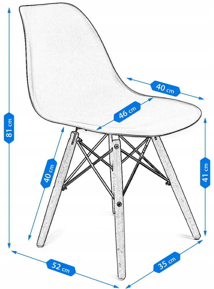 • Wymiary: wysokość mebla 81 cm, szerokość mebla 46 cm; głębokość mebla 52 cm; wysokość siedziska 41 cm; szerokość siedziska 46 cm; głębokość siedziska 40 cm; obciążenie maksymalne 100 kg.