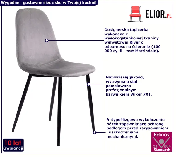 Aby zadbać o Twój jak najwyższy poziom satysfakcji z zakupu dokonanego w naszym sklepie producenci marki Edinos Premium dokładają wszelkich starań podczas produkcji wszystkich mebli. W przypadku prezentowanego krzesła atutem jest jego materiał tapicerki. Designerska tapicerka mebla w wykonana została z wysokogatunkowej tkaniny River - to gęsta i aksamitna tkanina obiciowa typu velvet. Materiał ten jest niesamowicie miękki i aksamitny w dotyku, a do tego lekko połyskuje dodając całości szlachetności i elegancji. River to jeden z francuskich welurów posiadający bardzo dobrą odporność na ścieranie (do 100 000 cykli - test Martindale). Ponadto podstawa stworzony jest z najwyższej jakości stali pomalowanej odpornym na zarysowania i zadrapania. Najwyższa jakość techniki polimeryzacji pozwoliła zaoferować marce Edinos Premium aż 10 lat gwar. na swoje produkty. Zapomnisz o stresie, że po kilku latach część farby odpryśnie od mebla . Dodatkowo krzesło zostało wyposażone w antypoślizgowe wykończenie nóżek, dzięki czemu w odpowiedni sposób zadbasz o podłogi w swoim domu.