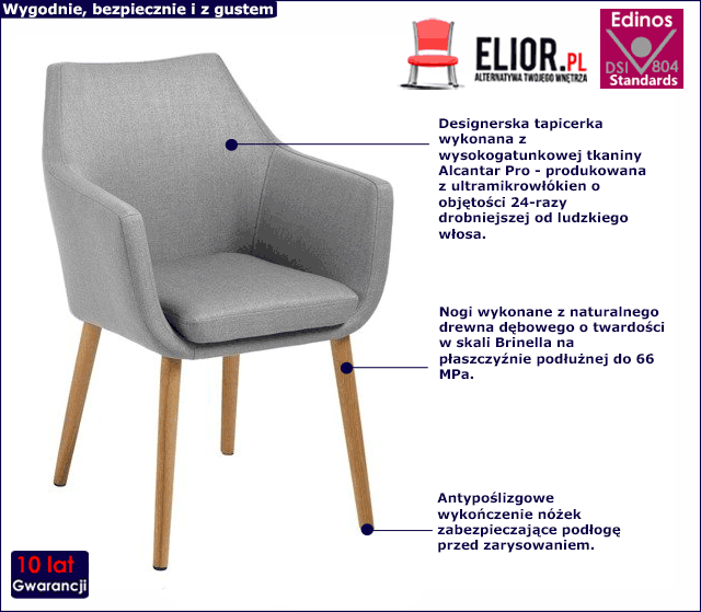 Możesz spokojnie zaufać meblom marki Elior, ponieważ do ich produkcji stosowane są wyselekcjonowane materiały o najwyższej jakości. W przypadku krzesła Naxo wybraliśmy solidną podstawę wykonaną z naturalnego drewna dębowego. Ten rodzaj drewna o wysokiej twardości charakteryzuje się gęstością w stanie suchym - do 930 kg/m3 i twardością w skali Brinella na płaszczyźnie podłużnej do 66 MPa. Na korzyść drewna dębowego przemawia również jego ciężar i odporność na odkształcenia, co świetnie sprawdza się w przypadku wykorzystywania go jako podstawa meblarska. Dzięki takim właściwościom możesz użytkować go do woli bez obaw, że nie utrzyma on ciężaru ciała. Ponadto, aby satysfakcja z siedzenia osiągnęła najwyższy poziom zastosowaliśmy tkaninę o niebywałych właściwościach. Designerska tapicerka wykorzystywana do produkcji mebli marki Elior to zasługa tkaniny Alcantar Pro, która jest trwała, łatwo się czyści i elegancko prezentuje. Ponadto charakteryzujące się dużą odpornością na ścieranie i zabrudzenia oraz niezwykłą miękkością w dotyku (dzięki warstwie poliuretanu). Tkanina Alcantar Pro, która jako jedyna na rynku produkowana jest z dokładnie wyselekcjonowanych ultramikrowłókien o objętości aż do 24-razy drobniejszej od ludzkiego włosa, charakteryzuje się wyjątkową żywotnością, odpornością oraz niezwykłą łatwością w utrzymaniu. Posiada ponadprzeciętne cechy wytrzymałościowe, dzięki czemu unikniesz co sezonowej wymiany tapicerki. Dodatkowo nóżki krzesła zostały wyposażone w antypoślizgowe wykończenie chroniące podłogę przed uszkodzeniami mechanicznymi i zarysowaniami.
