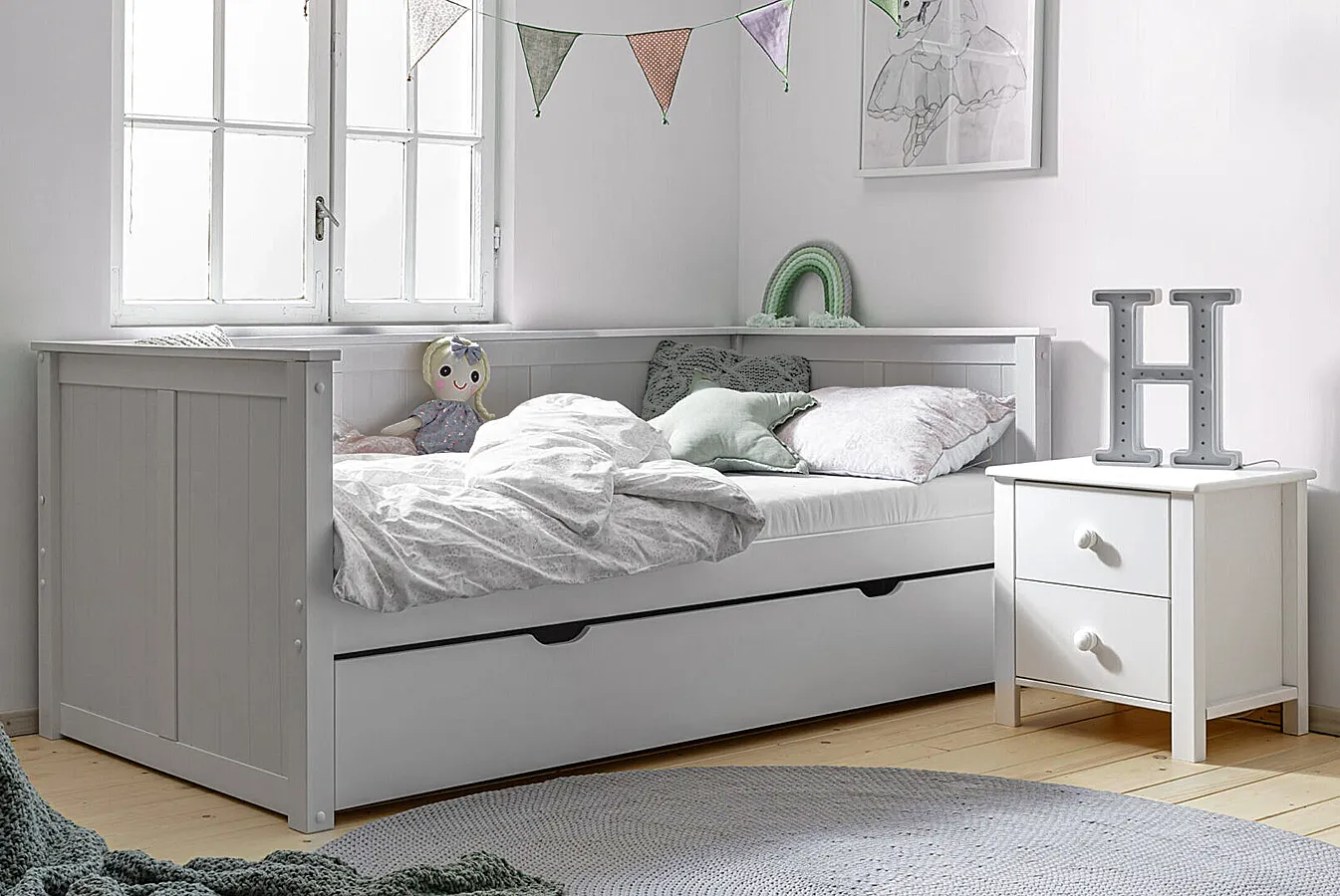- W zestawie praktyczna wysuwana szuflada na pościel z drewnianym stelażem i dodatkową powierzchnią do spania.