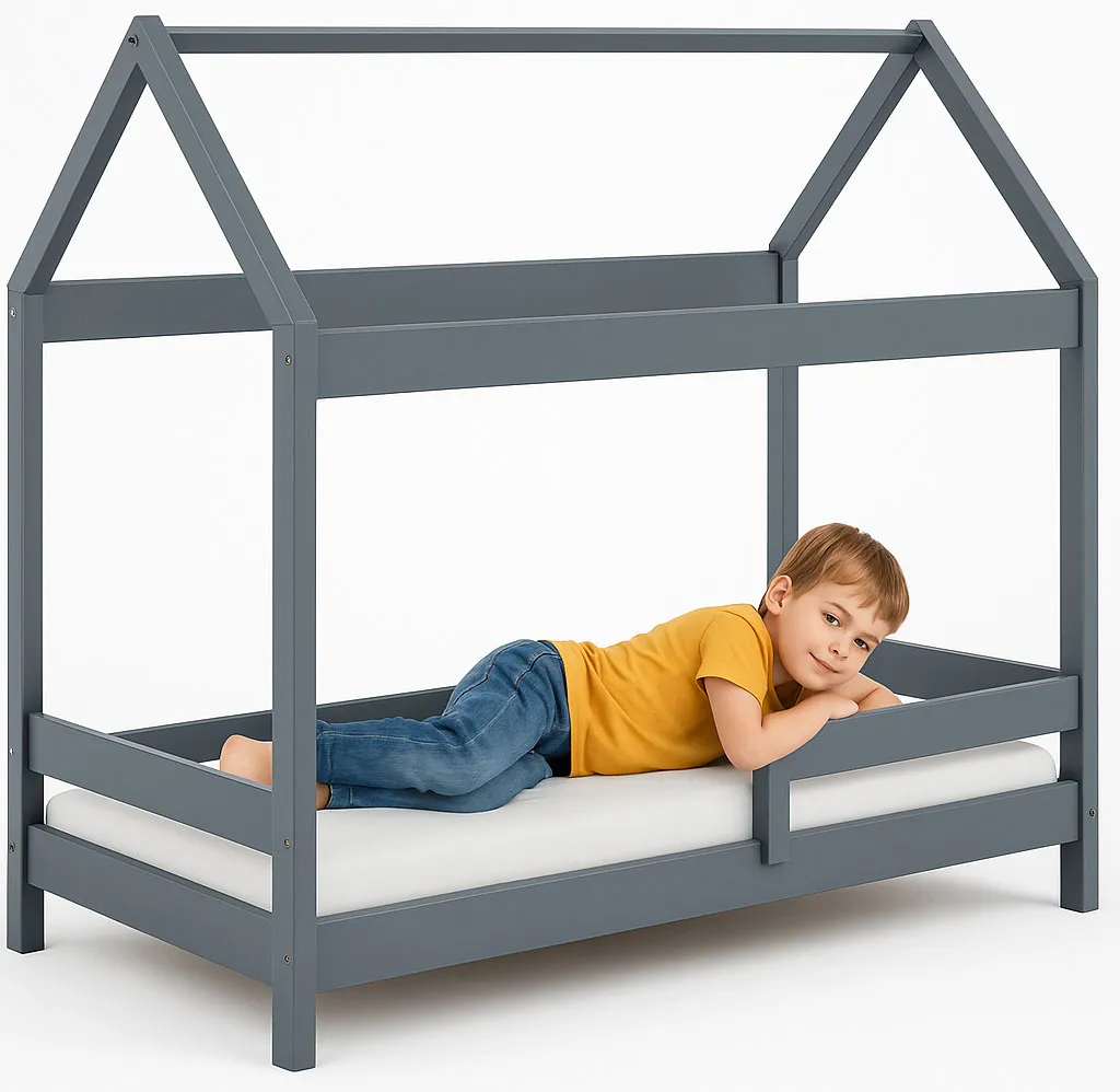 Infografika szarego dziecięcego pojedynczego łóżka typu domek Kiders