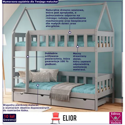 - Modny kolor: szary. W naszej ofercie posiadamy także inne łóżka dziecięce typu domek. Kliknij i stwórz swój wyjątkowy zestaw mebli. Jeśli potrzebujesz wersji łóżka bez szuflad jest ono dostępne tutaj.
