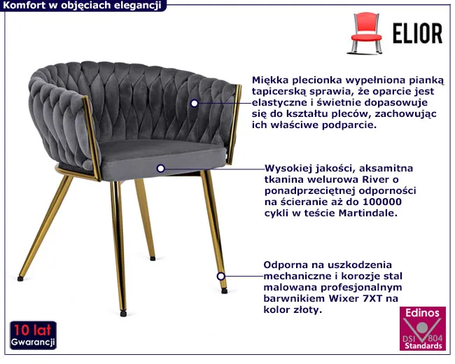 • Materiał: welurowa tkanina River o odporności ścieranie do do 100000 cykli w teście Martindale, odporna na uszkodzenia i korozje stal malowana barwnikeim na kolor złoty.