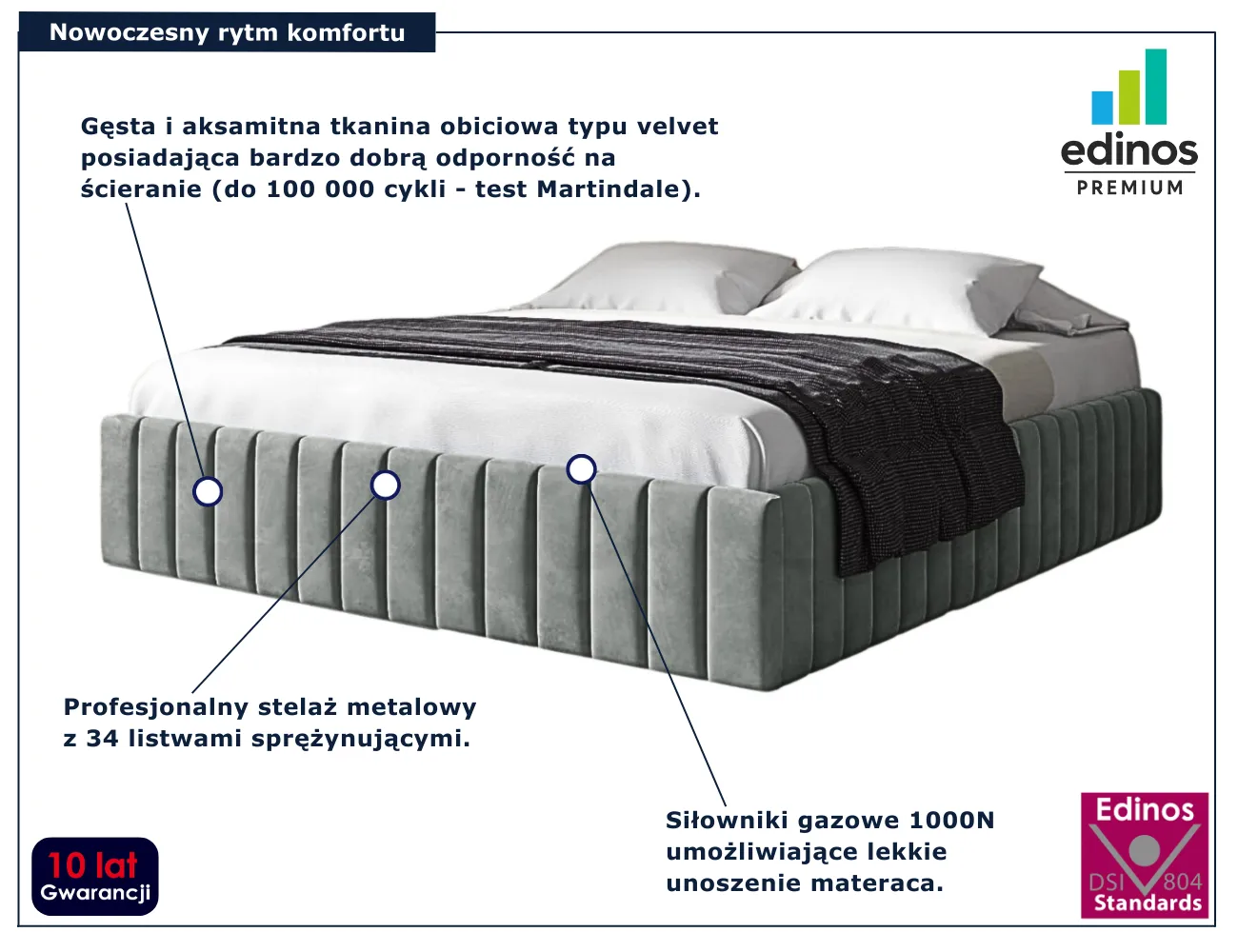 Tivrro marki Edinos Premium to łóżko stworzone z myślą o osobach, które kochają minimalistyczny design połączony z elegancją i funkcjonalnością. Regularne, pionowe przeszycia podkreślają idealnie proporcje bryły i nadają jej spokojnego, harmonijnego charakteru. Solidny metalowy stelaż z 34 listwami sprężynującymi oraz siłowniki gazowe 1000N gwarantują stabilność i komfort użytkowania, a niska, pozbawiona nóżek forma tworzy efekt nowoczesnej, wizualnie lekkiej konstrukcji. Tivrro to propozycja dla tych, którzy chcą wprowadzić do swojej sypialni równowagę, estetykę i wygodę na lata.