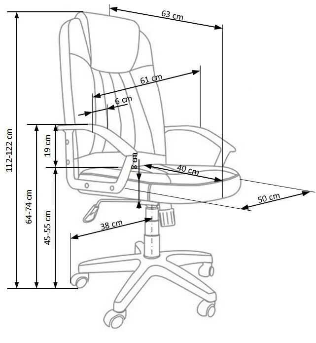 - Wymiary: szerokość mebla: 61 cm, szerokość siedziska: 50 cm, głębokość mebla: 63 cm, głębokość siedziska: 40 cm, wysokość krzesła: 112-122 cm, wysokość siedziska: 45-55 cm.