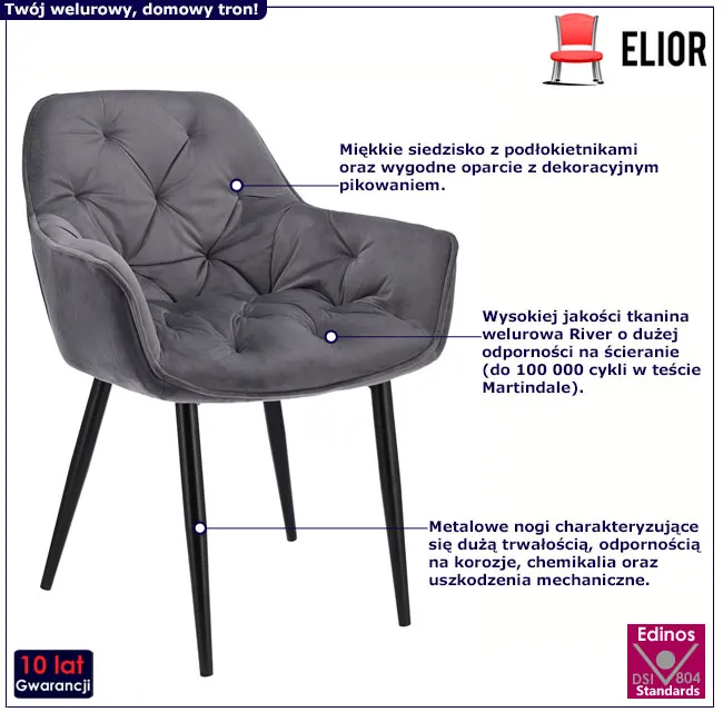• tapicerka krzesła została wykonana z aksamitnej tkaniny welurowej River, która wyróżnia się dużą odpornością na ścieranie (do do 100000 cykli w teście Martindale)