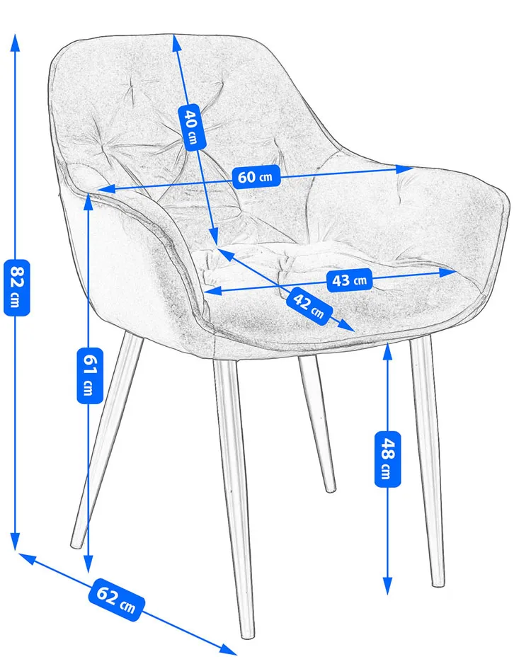 • Wymiary: szerokość mebla: 60 cm, głębokość mebla: 62 cm, wysokość całkowita: 82 cm, szerokość siedziska: 43 cm, głębokość siedziska: 42 cm, wysokość siedziska: 48 cm.