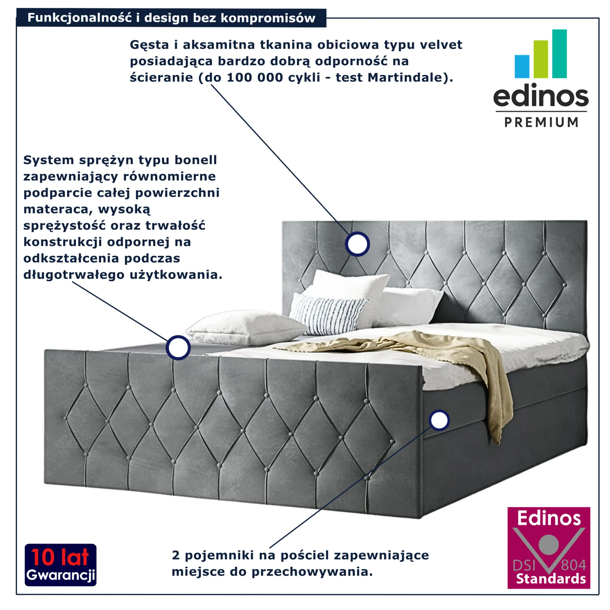 • Produkt posiada certyfikat jakości "Edinos Standards DSI 804", który potwierdza najwyższą jakość wykonania mebla oraz pełny stopień zgodności poszczególnych jednostek wytworzonego wyrobu z przyjętym wzorcem.