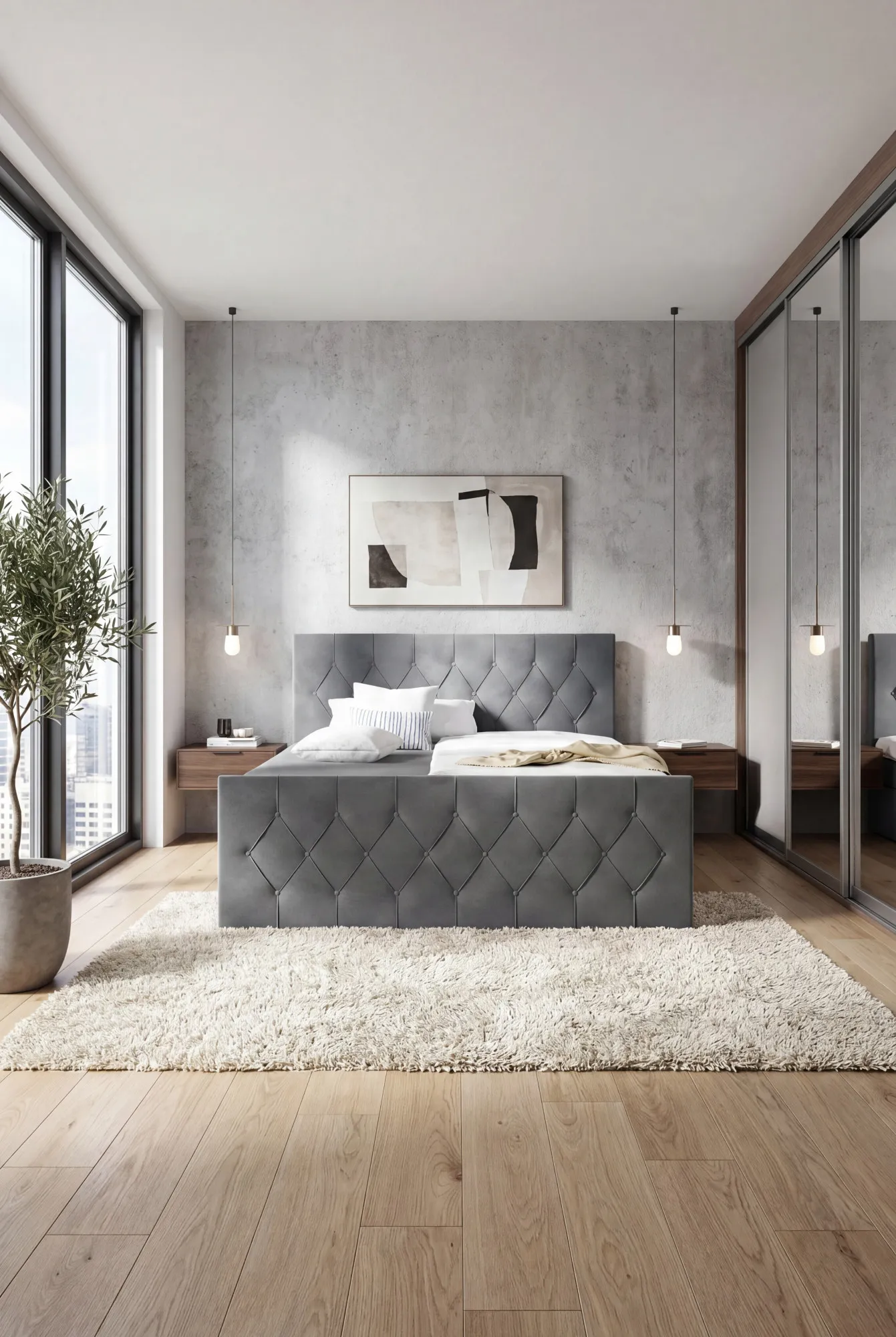 Aranżacja sypialni z szarym łóżkiem kontynentalnym Omelisse