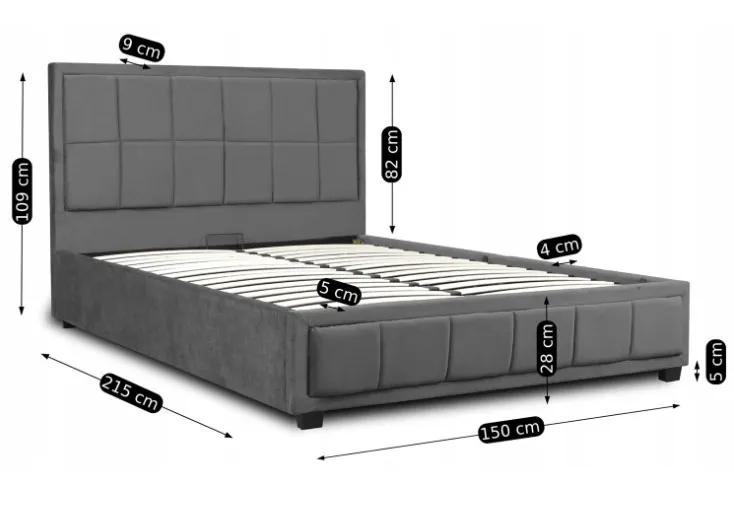 • Wymiary całkowite łóżka: długość: 215 cm, szerokość: 150 cm, wysokość z zagłówkiem: 109 cm.