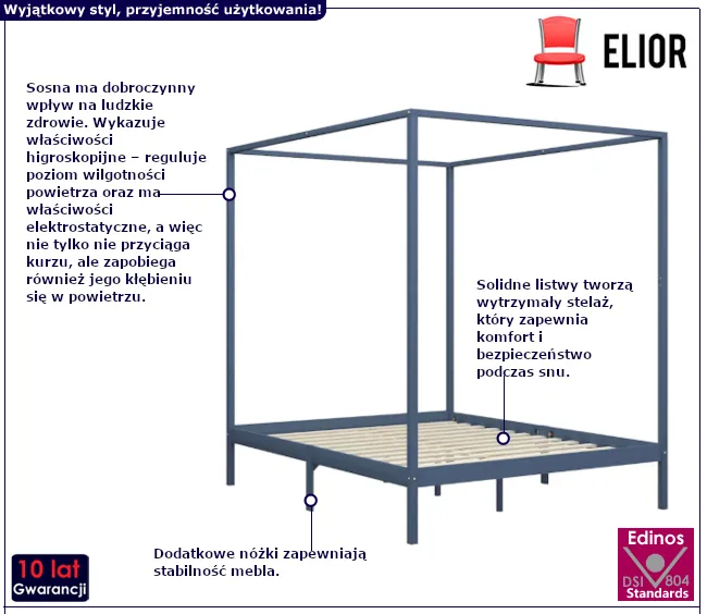 • Trwała i stabilna konstrukcja została w całości wykonana z naturalnego drewna sosnowego. Drewno sosnowe jest sprężyste, a jednocześnie odporne na różnego rodzaju uszkodzenia mechaniczne. Ponadto sosna ma dobroczynny wpływ na ludzkie zdrowie. Wykazuje właściwości higroskopijne – reguluje poziom wilgotności powietrza przez pochłanianie i oddawanie pary wodnej do otoczenia. Dodatkowo sosna ma właściwości elektrostatyczne, a więc nie tylko nie przyciąga kurzu, ale zapobiega również jego kłębieniu się w powietrzu.