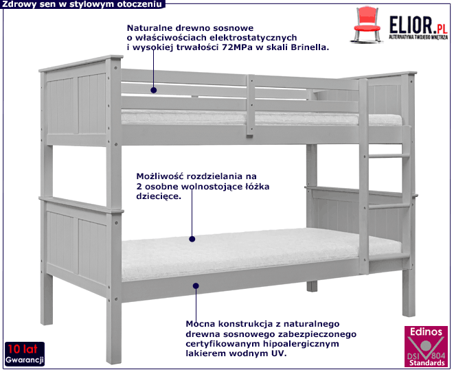Zdrowy rozwój i bezpieczeństwo Twojego dziecka to priorytety marki Elior, dlatego nasze produkty zawsze są wykonane z najwyższej jakości, ekologicznych i biodegradowalnych materiałów. Do produkcji łóżka Isadora 4X wybraliśmy wysokiej jakości naturalne drewno sosnowe, o wysokiej sprężystości i odporności na różnego rodzaju uszkodzenia mechaniczne. Drewno sosnowe ma dobroczynny wpływ na zdrowie, a dzięki właściwościom higroskopijnym, genialnie reguluje poziom wilgotności powietrza. Dodatkowo sosna ma właściwości elektrostatyczne, a więc nie tylko nie przyciąga kurzu, ale zapobiega również jego kłębieniu się w powietrzu. Łóżka z drewna sosnowego są prozdrowotne i w pełni ekologiczne, dlatego szczególnie polecane są alergikom i małym dzieciom. Drewno, którego używamy do produkcji naszych mebli pochodzi z lasów zarządzanych zgodnie ze standardami prawidłowej gospodarki leśnej. Mamy pewność, że w miejsce drzewa, z którego powstało łóżko Isadora 4X, zostanie posadzone kolejne. Gwarantujemy to certyfikatem FSC. Dla podniesienia stopnia jakości i bezpieczeństwa dokładnie oszlifowane drewno zabezpieczyliśmy ekologicznym, hipoalergicznym lakierem wodnym UV. Emulsje ochronne marki Elior produkowane na bazie wody są całkowicie wolne od formaldehydu, dzięki czemu charakteryzują się neutralnym zapachem. Nie zawierają substancji, które w trakcie użytkowania mebli mogą się ulatniać, ani innych szkodliwych związków chemicznych. Dzięki temu są dobrze tolerowane przez alergików oraz osoby wrażliwe i co najważniejsze mają neutralny wpływ na zdrowie Twojego dziecka . Nie ryzykuj zdrowia i bezpieczeństwa swoich pociech i inwestuj rozsądnie z marką Elior! Wybierz idealne łóżko dla swoich dzieci – wybierz piętrowe łóżko Isadora 4X!