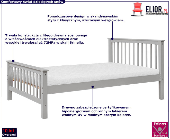 Marka Elior od lat specjalizuje się w produkcji wysokogatunkowych i komfortowych mebli o najwyższych parametrach jakościowych. Szczególną uwagę poświęcamy projektom mebli dedykowanych najmłodszym użytkownikom. Poza idealną jakością i absolutnym bezpieczeństwem meble dziecięce powinny mieć przyjazny design na najwyższym światowym poziomie. I taki właśnie jest nasz najnowszy produkt – łóżeczko dziecięce Toca 5X. Toca 5X to komfortowe sosnowe łóżko w pastelowej szarości, pięknie komponującej się z jasną kolorystyką pokoju dziecięcego. Prosta rama z urokliwym ażurowym wezgłowiem i zanóżkiem to klasyczna i najbezpieczniejsza forma łóżka dziecięcego, sprawdzona przez wiele pokoleń milusińskich. Ponadczasowy design, precyzyjne wykonanie i wysoki poziom estetyczny detali wykończeniowych rewelacyjnie wpisze się w ulubione dziecięce aranżacje, od skandynawskiej, klasycznej, marynistycznej, aż po klimaty w stylu rustykalnym, steampunk czy minimalistycznym. Tak zaprojektowane łóżko Toca 5X w 100% spełni Twoje wymagania, zapewniając zdrowy i bezpieczny sen Twojemu szkrabowi. Nie mamy wątpliwości, że spodoba się także Twojemu dziecku!