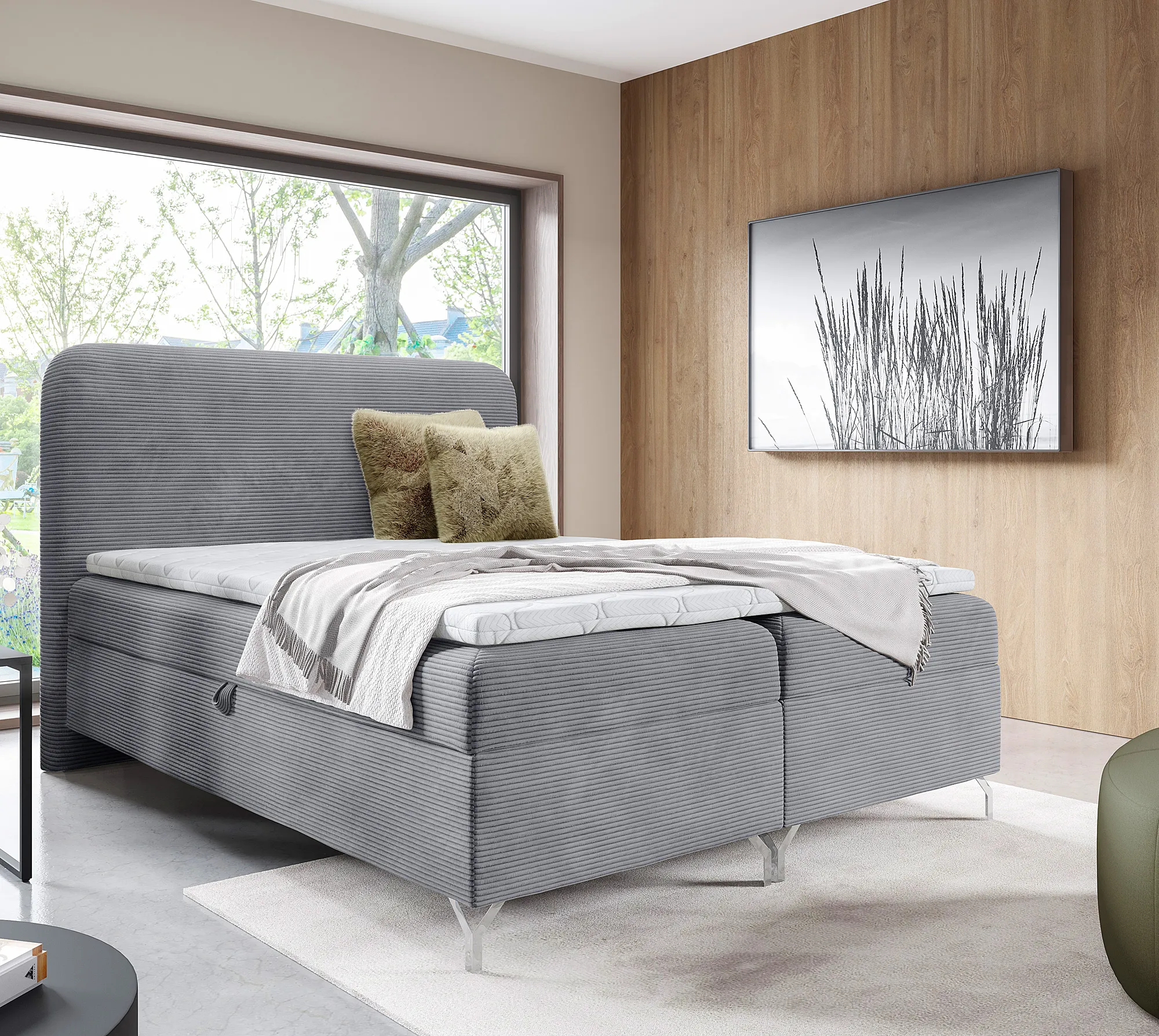 Aranżacja wnętrza z szarym łóżkiem Aurellia