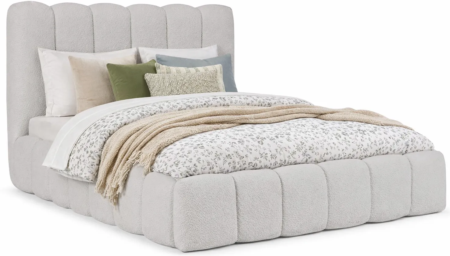 Łóżko Nuvessa to kwintesencja współczesnego komfortu – projekt, który łączy w sobie delikatność formy i solidność wykonania. Inspirowane kształtem obłoków, zachwyca miękką, zaokrągloną bryłą i tapicerowanym zagłówkiem o harmonijnych, pionowych przeszyciach. Jego wyjątkowa konstrukcja sprawia, że już na pierwszy rzut oka zaprasza do wypoczynku, a każda noc w jego objęciach staje się czystą przyjemnością. Wyróżnia je tapicerka wykonana z tkaniny bouclé – materiału o przyjemnej, pętelkowej strukturze, który kojarzy się z ciepłem i domowym spokojem. Ta tkanina nie tylko nadaje łóżku niepowtarzalny wygląd, ale także podkreśla jego przytulny, miękki charakter.