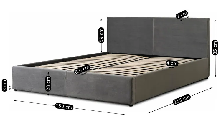 • Wymiary całkowite łóżka: długość: 215 cm, szerokość: 150 cm, wysokość z zagłówkiem: 85 cm.