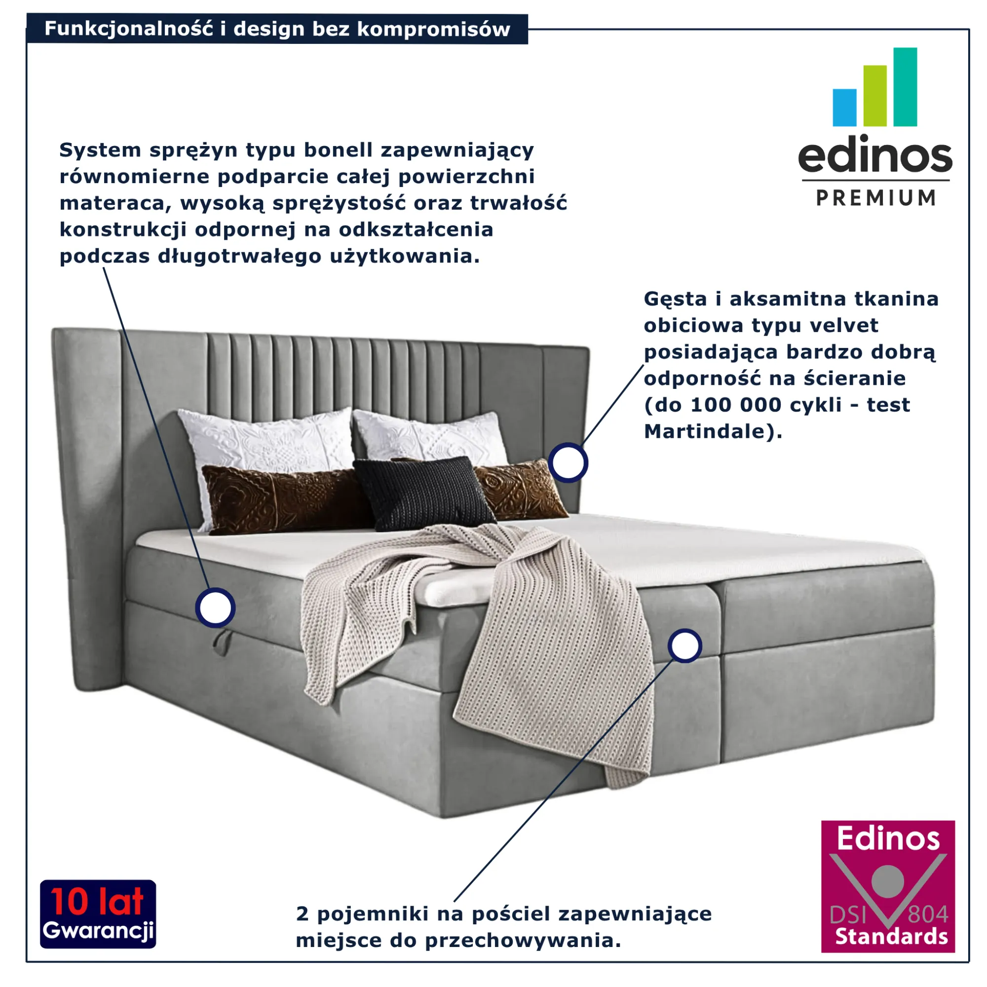 • Produkt posiada certyfikat jakości "Edinos Standards DSI 804", który potwierdza najwyższą jakość wykonania mebla oraz pełny stopień zgodności poszczególnych jednostek wytworzonego wyrobu z przyjętym wzorcem.