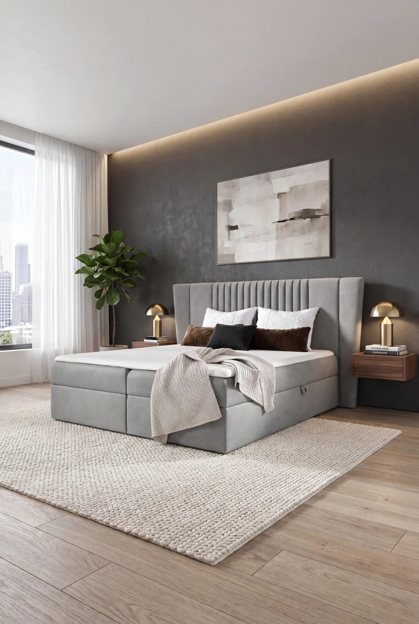 Aranżacja sypialni z szarym łóżkiem kontynentalnym Orlento