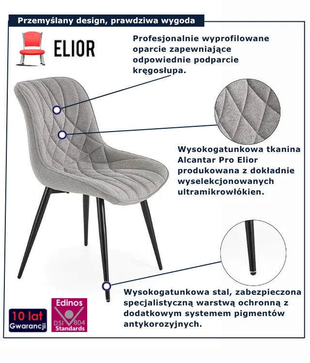 • Produkt posiada certyfikat jakości "Edinos Standards DSI 804", który potwierdza najwyższą jakość wykonania mebla oraz pełny stopień zgodności poszczególnych jednostek wytworzonego wyrobu z przyjętym wzorcem.