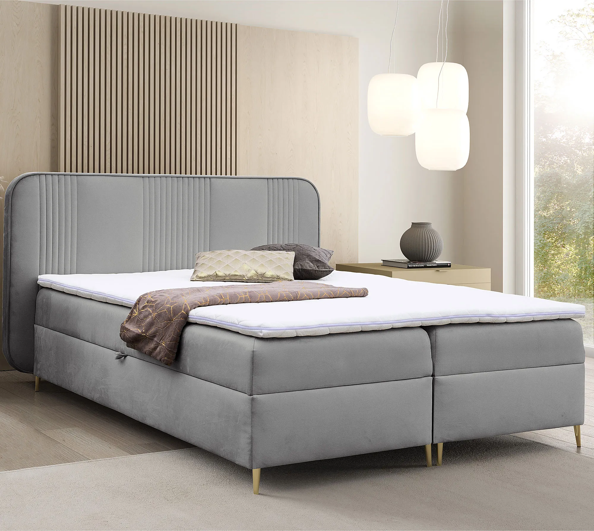 Averell marki Edinos Premium to łóżko kontynentalne stworzone dla osób, które pragną połączyć nowoczesny design z codzienną wygodą na najwyższym poziomie. Finezyjnie zaoblone wezgłowie z ozdobnymi, pionowymi przeszyciami dodaje wnętrzu harmonii i wyjątkowego charakteru. Komfortowy system spania z materacem bonellowym i miękkim topperem zapewnia przyjemne podparcie ciała, a dwa pojemniki na pościel pomagają utrzymać w sypialni doskonały porządek. Subtelnie połyskujące, złote nóżki podkreślają elegancję formy, czyniąc Averell meblem, który od pierwszego spojrzenia budzi zachwyt.