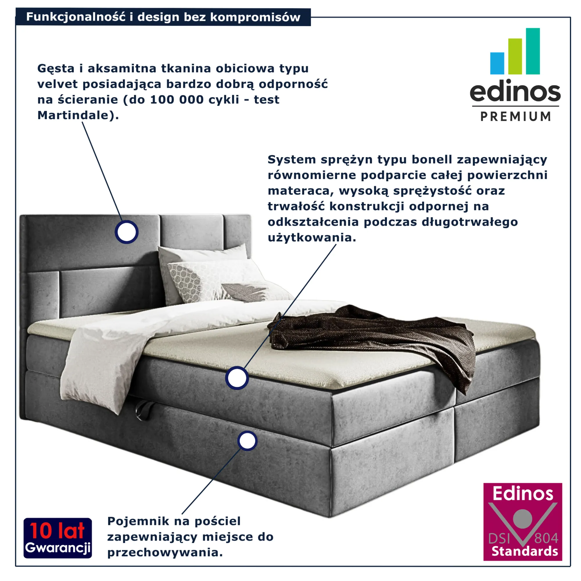 • Produkt posiada certyfikat jakości "Edinos Standards DSI 804", który potwierdza najwyższą jakość wykonania mebla oraz pełny stopień zgodności poszczególnych jednostek wytworzonego wyrobu z przyjętym wzorcem.