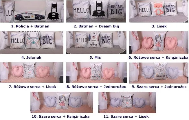 - Do wyboru 5 kolorów baldachimu Areon 3X: różowy z białą firanką, różowy z różową firanką, szary z białą firanką, szary z szarą firanką i szaro-czarny z białą firanką oraz 11 wzorów poduszek: Policja + Batman, Batman + Dream Big, Jelonek, Lisek, Miś, Różowe serca + Księżniczka, Szare serca + Księżniczka, Szare serca + Jednorożec, Różowe serca + Jednorożec, Różowe serca + Lisek, Szare serca + Lisek. Poinformuj nas o wybranych modelach w polu "Komentarz do zamówienia" lub drogą mailową.