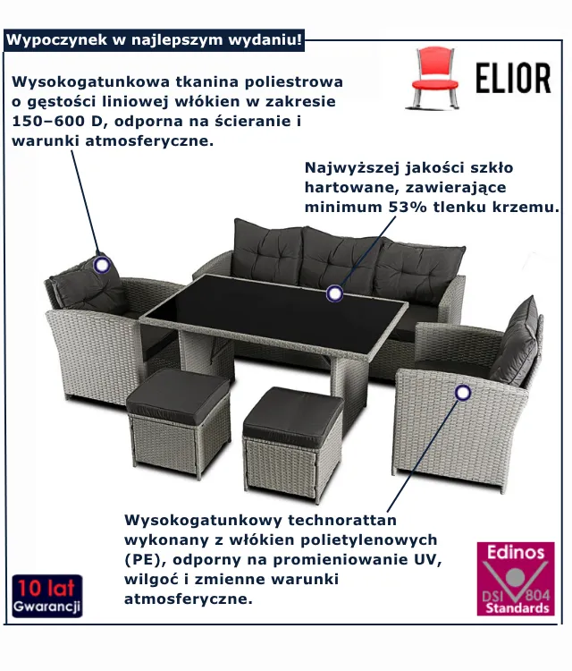 • Technorattan wykonany z włókien polietylenowych (PE), odporny na promieniowanie UV, wilgoć i zmienne warunki atmosferyczne.