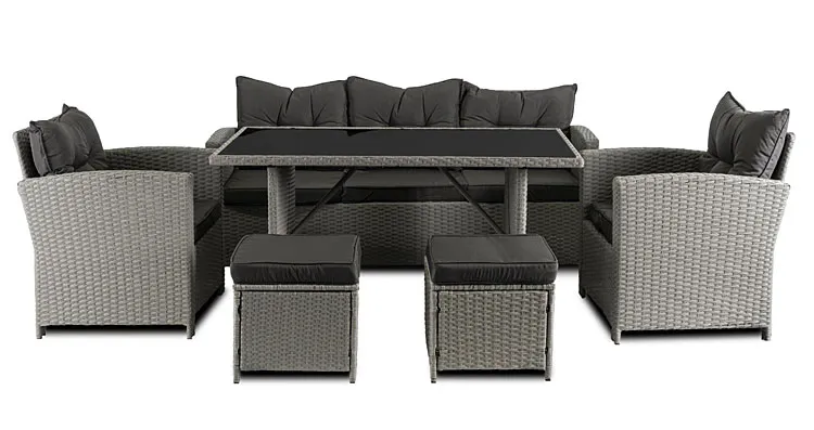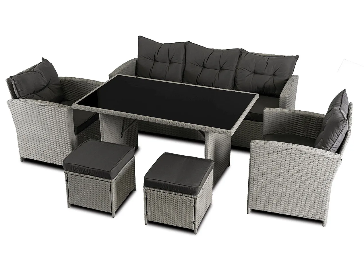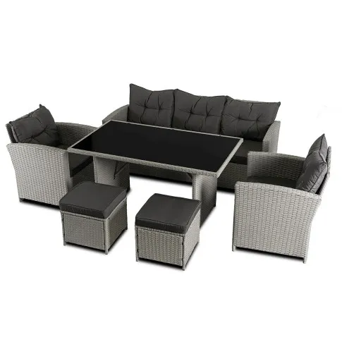 • Kompletny zestaw – sofa, fotele, pufy i stół idealny do wspólnych posiłków