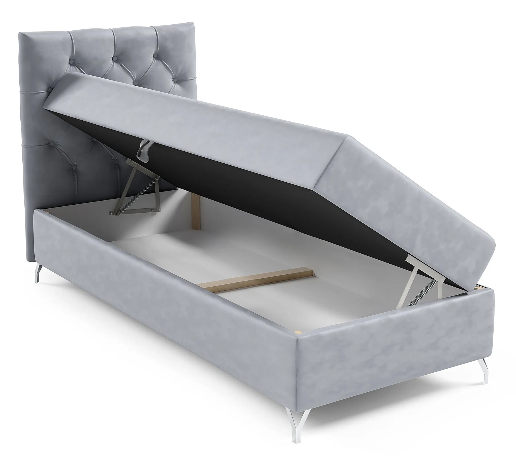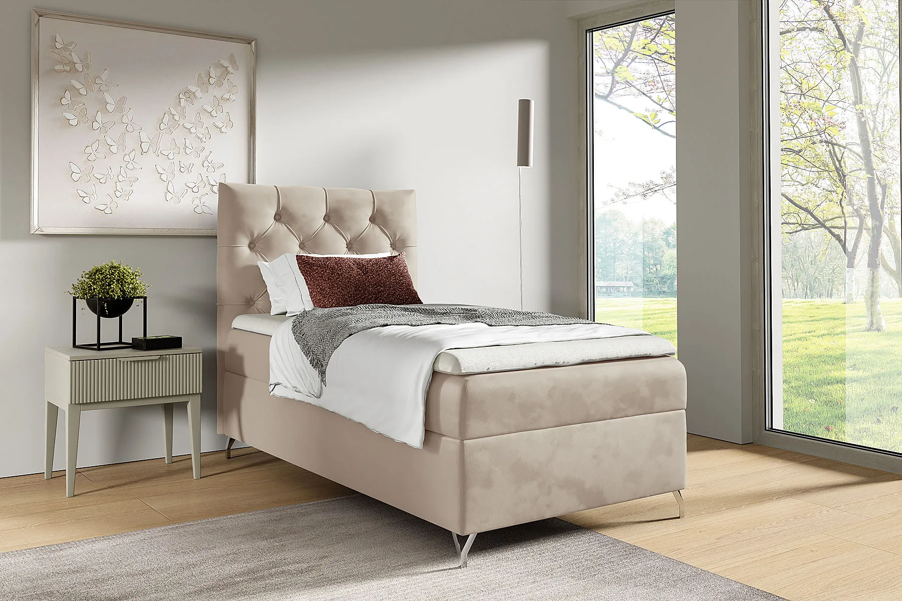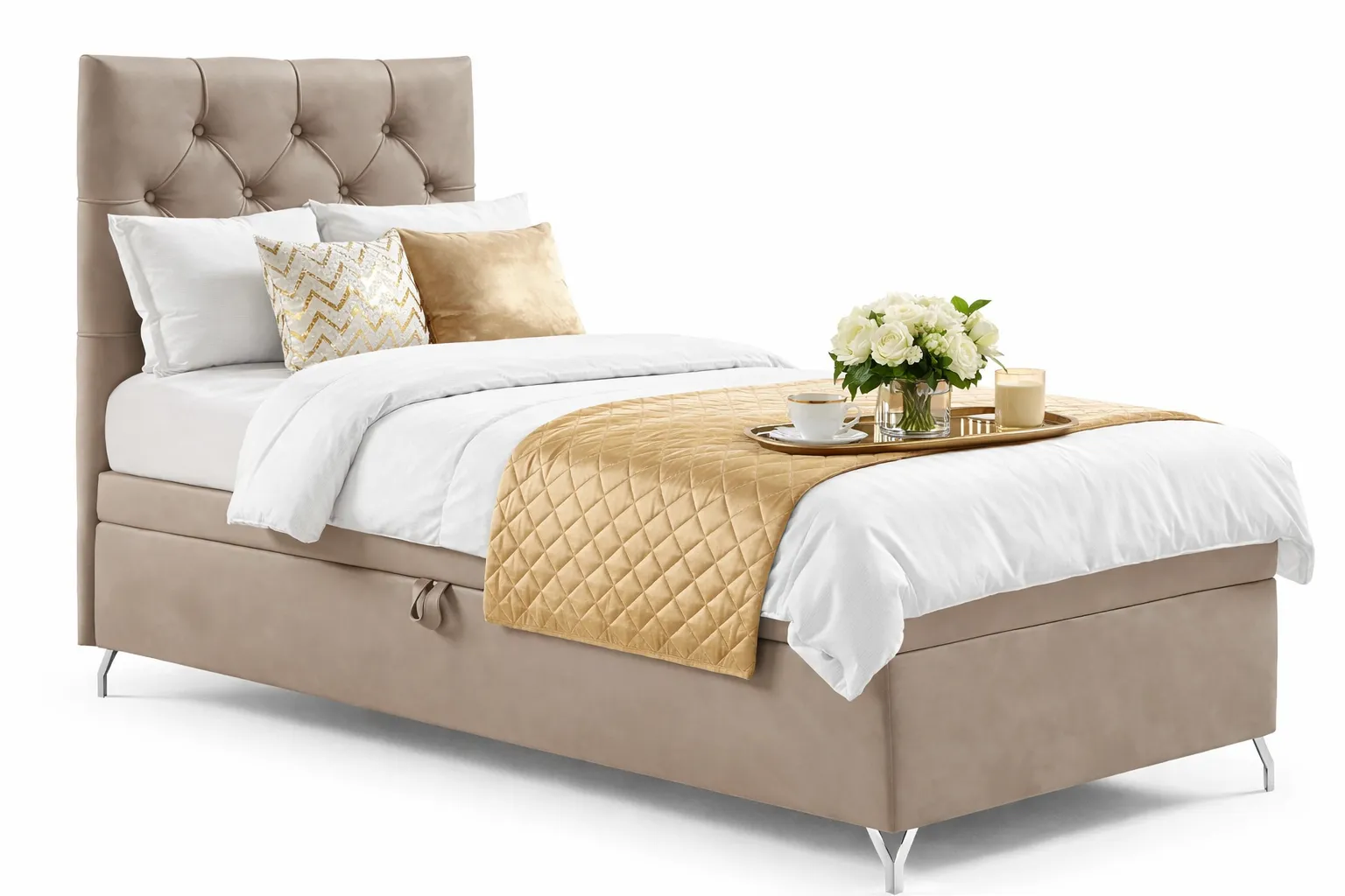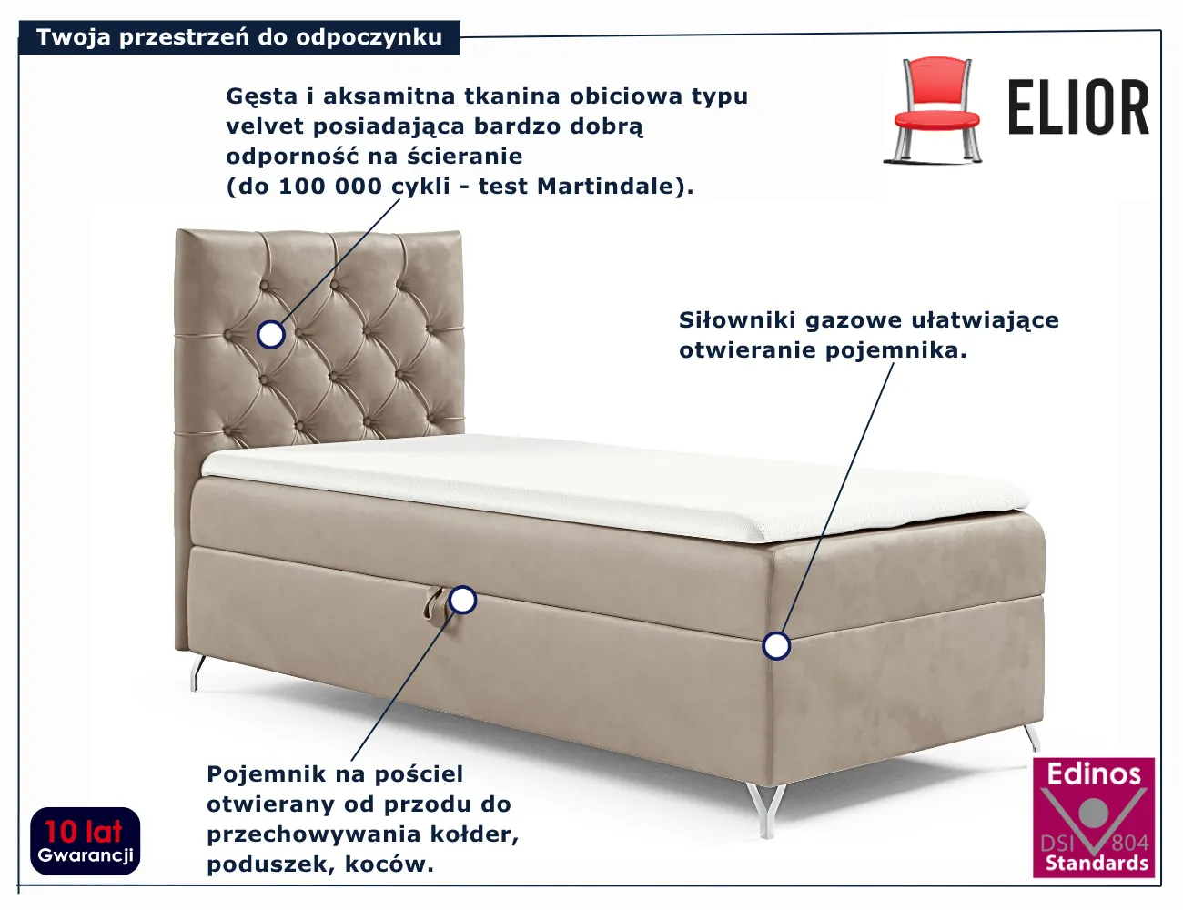 Łóżko Ferrise marki Edinos Premium to propozycja dla osób, które poszukują połączenia funkcjonalności i stylu w kompaktowej formie. Klasyczne pikowane wezgłowie inspirowane stylem Chesterfield nadaje mu ponadczasowej elegancji, a smukłe, chromowane nóżki podkreślają nowoczesny charakter bryły. Dzięki temu mebel świetnie odnajdzie się zarówno w minimalistycznych, jak i bardziej tradycyjnych wnętrzach. Pod materacem kryje się przestronny pojemnik, który ułatwia przechowywanie pościeli, koców czy innych domowych akcesoriów. Wbudowany automat sprężynowy sprawia, że dostęp do niego jest szybki, lekki i całkowicie bezproblemowy. To idealne rozwiązanie dla osób, które cenią porządek i praktyczne detale.