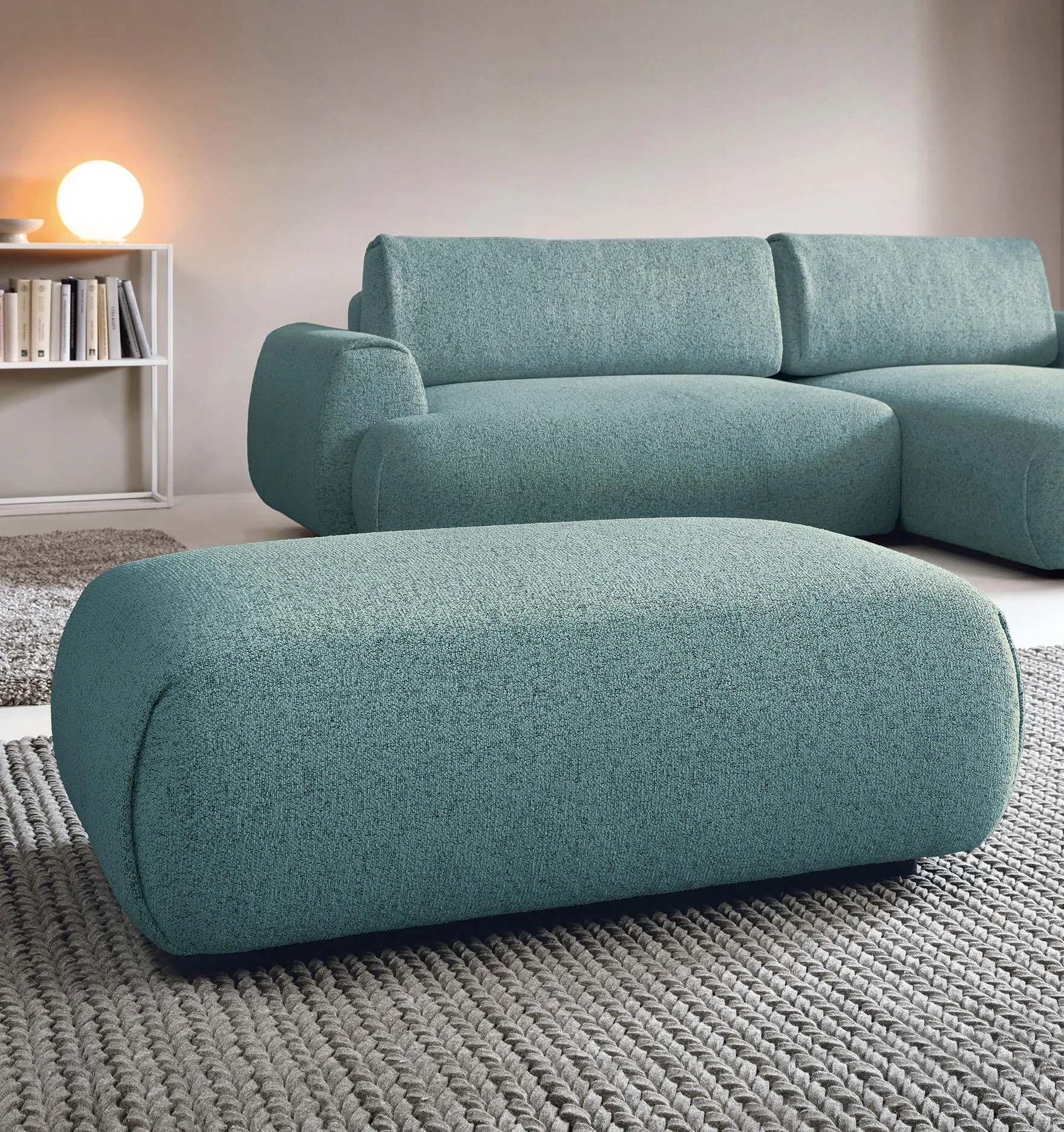 Przykładowa aranżacja z wykorzystaniem dużej szaroniebieskiej pufy Mezzia 4X