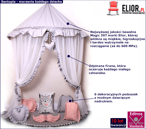 Zanim przejdziemy do praktycznego zastosowania naszego namiotu poznaj produkt "od kuchni". Na początku skupmy się na materiałach. Producent Marki Edinos Premium troszczy się o jakość swoich mebli, dlatego baldachim Areon 4X wykonaliśmy z najwyższej jakości bawełny Magic 3XT marki Edinos Premium. Bawełna to naturalna tkanina, która nie uczula, zapewnia przewiewność jest przyjemna w dotyku i bardzo wytrzymała. To idealny materiał dla każdego szkraba. Bawełniany daszek połączyliśmy z delikatną firanką, którą ozdobiliśmy uroczą falbaną. Zestaw uzupełniliśmy matą z aksamitnego pikowanego materiału River 7XT marki Edinos Premium. Tkanina jest lekka, odporna na uszkodzenia i nieziemsko delikatna. Twoje dziecko będzie zachwycone.